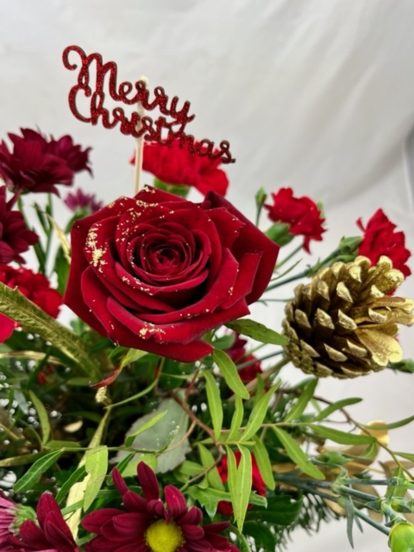 Choose a more environmentally friendly option this Christmas, with this beautiful festive arrangement of flowers, presented in a pretty matching vase - no plastic wrappings to dispose of!