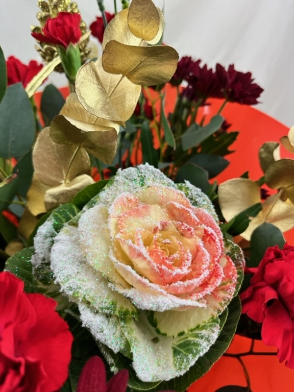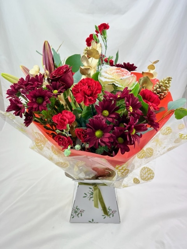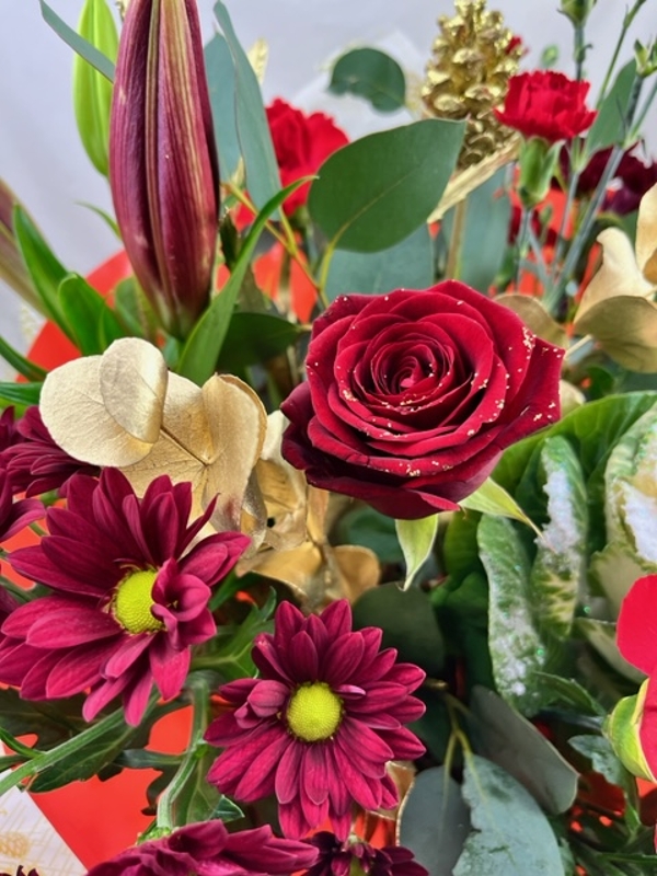 This "cracker" of a bouquet is full of mixed flowers in beautiful shades of red, with some gold Christmas bling to make it really festive.